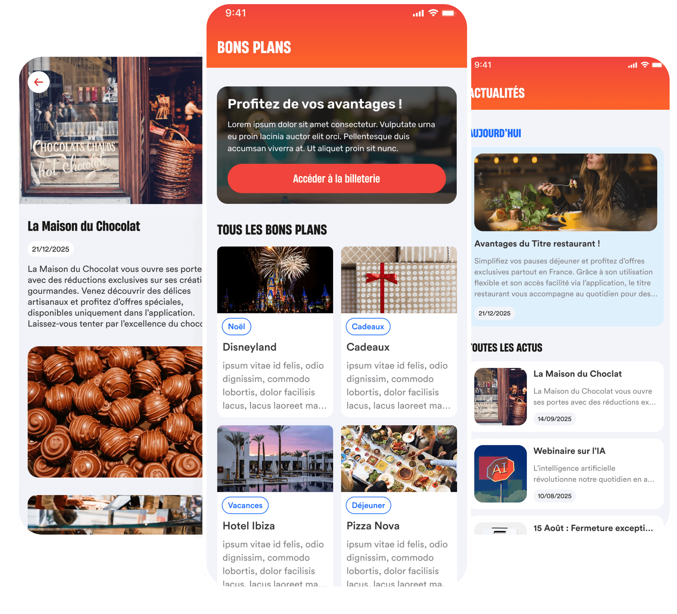L’application met en avant les actualités de l’entreprise à travers des articles variés et thématiques. Elle propose également un accès à la billetterie avec des bons plans et suggestions, triés par catégorie (cadeaux, vacances, déjeuner, etc.).