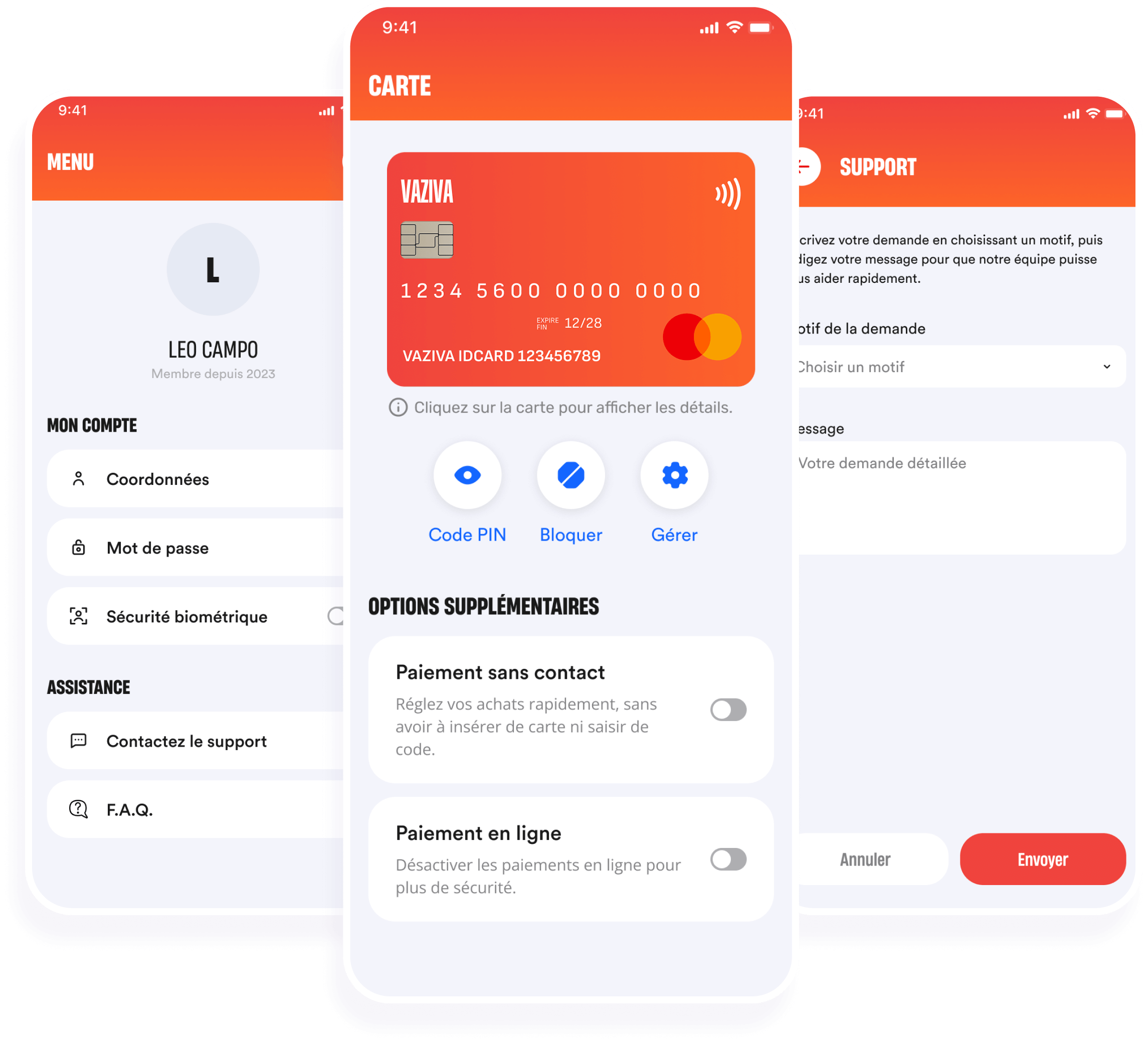 L’application permet de gérer facilement sa carte bancaire: blocage ou déblocage instantané, consultation du code PIN et activation du paiement sans contact. L’utilisateur accède à son profil pour modifier ses coordonnées et personnaliser la sécurité, notamment via la biométrie.